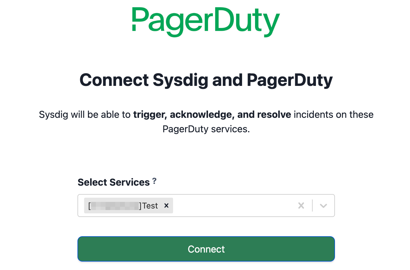 ログイン後、Connect Sysdig and PagerDuty の画面で、Select Services で既存の Service を選択して Connect します。