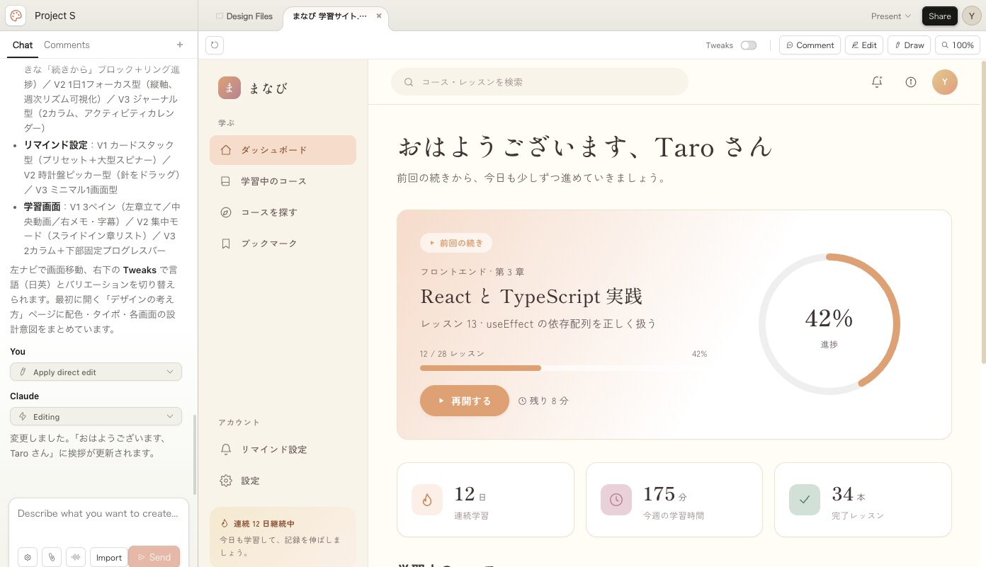 初稿はClaude Designでデザインベースで。そのあとは開発へ移行して機能の追加やコードもしっかりと書いていきたい場合は、かなりスムーズに移行することができます。