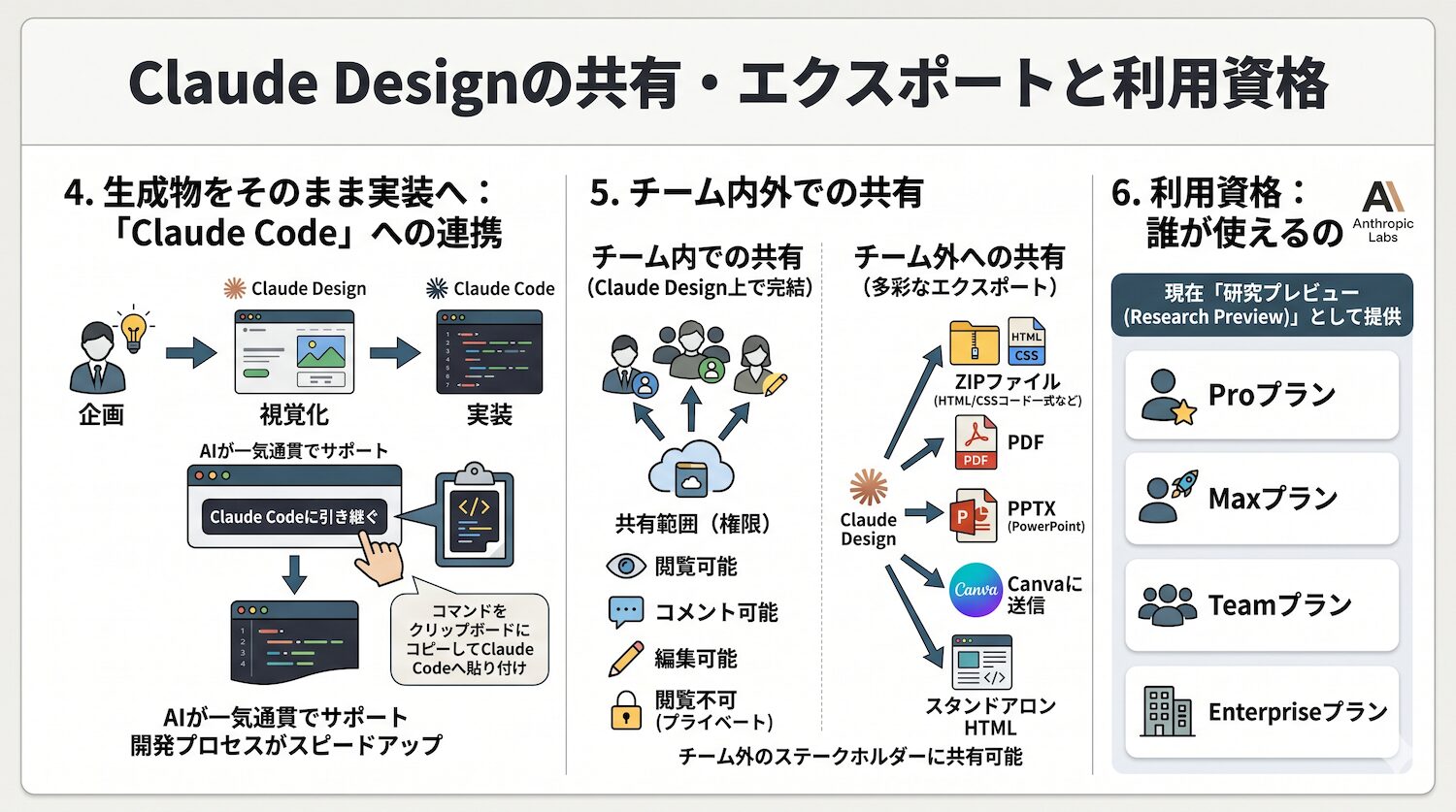 また、このあとにもご紹介しますが、現在は同じプランのTeamメンバーでの共有が可能なので、「デザイナーがClaude Designでデザイン作成 → エンジニアがClaude Codeで開発」といったこともシームレスに実現します!