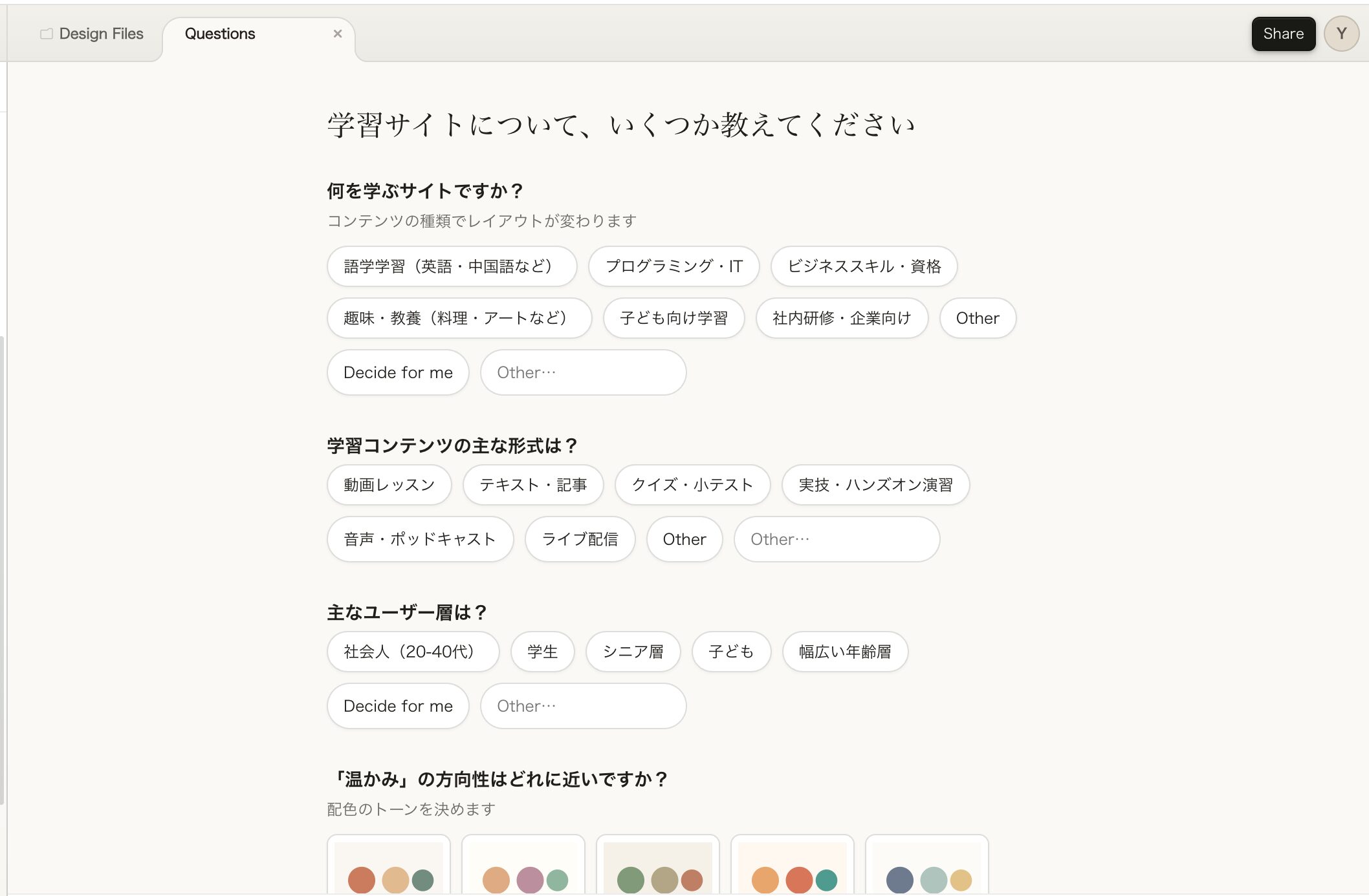 - ヒアリングから始まるデザイン: AIが「ブランドカラー」「ユーザー層」など、ユーザーの期待に沿ったDesign Systemを構築するための質問事項が多く用意されています。