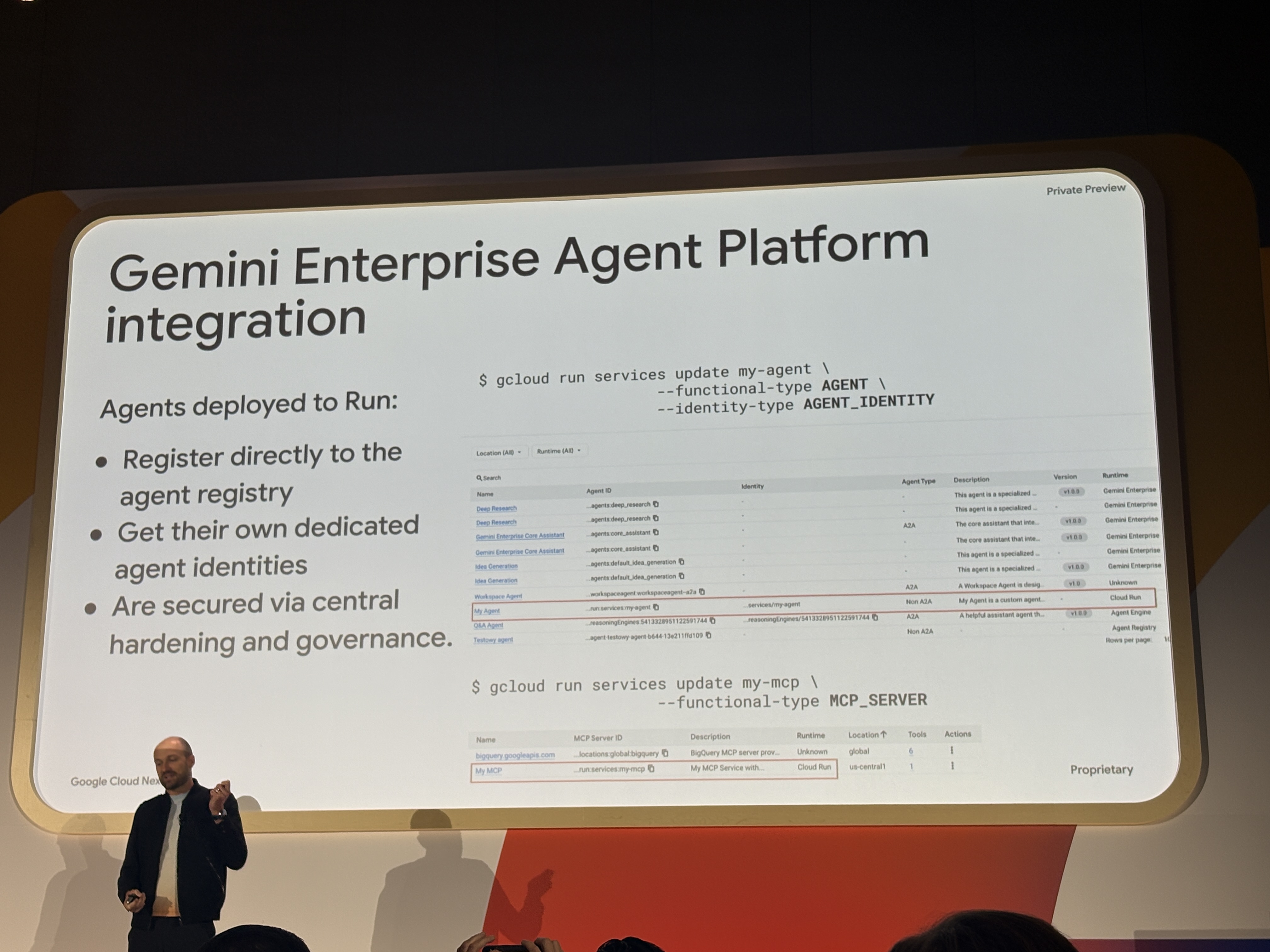 Cloud Runにデプロイしたサービスに --functional-type AGENT を付けるだけで、Gemini Enterprise Agent Platformのエージェントレジストリに自動登録されます。(Gemini Enterprise Agent Platformは同日に発表されたVertex AIのリネーム後のサービスです)