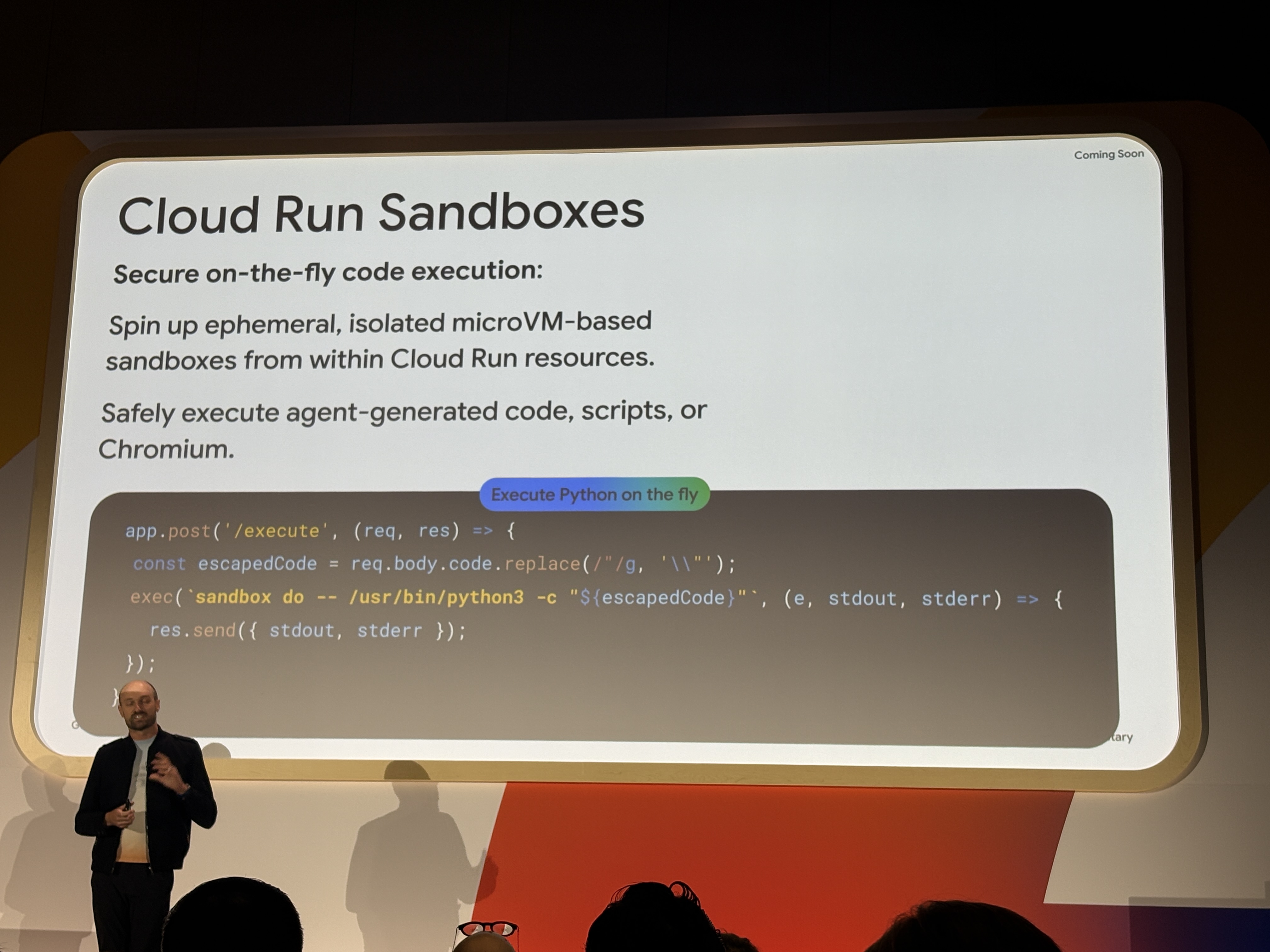 Cloud RunリソースからmicroVMベースの隔離サンドボックスを起動して、エージェントが生成したPythonコードやシェルスクリプト、さらにChromiumも実行可能とする機能です。