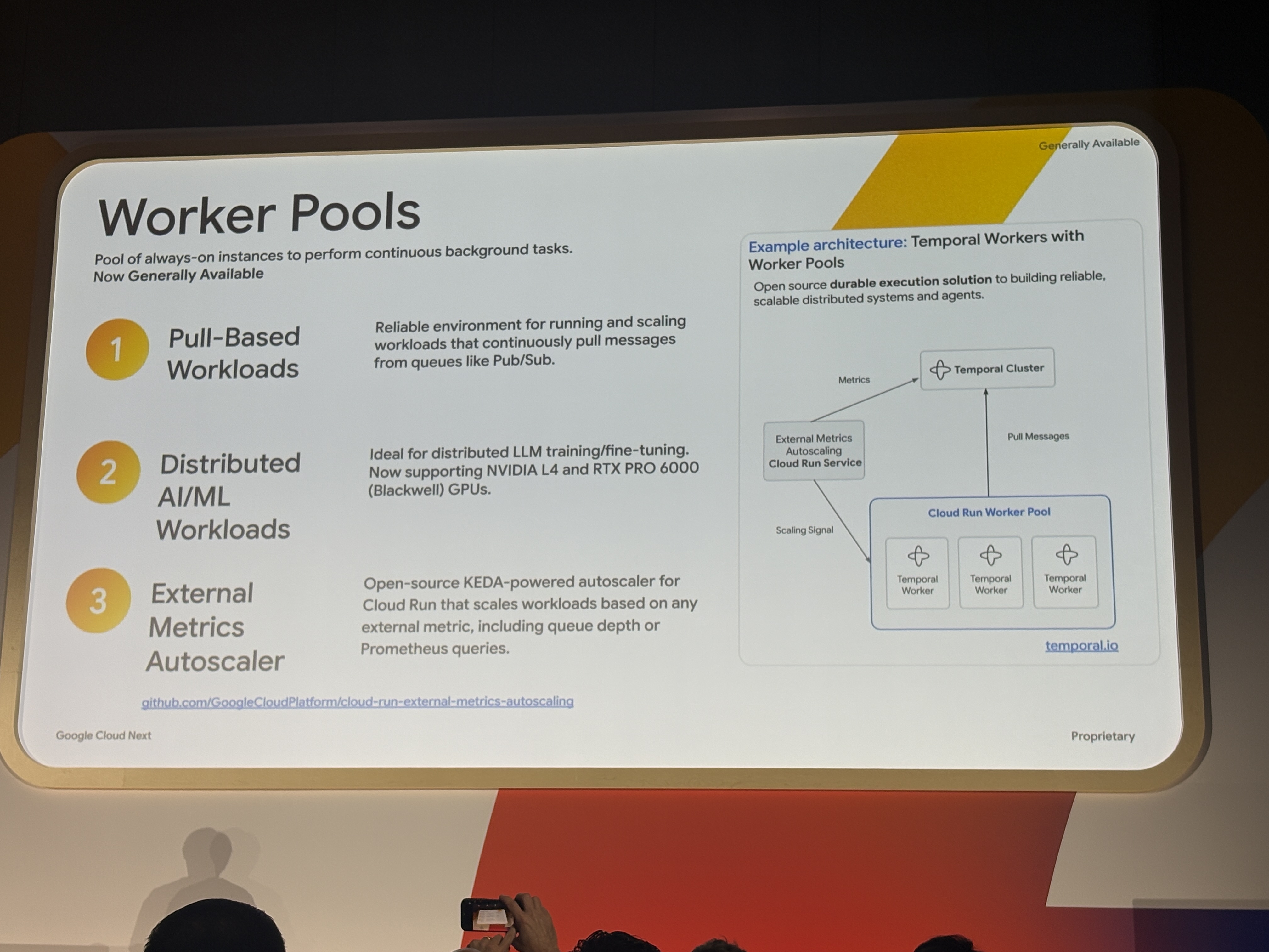 Temporalとの連携事例が紹介されていて、TemporalワーカーがCloud Run Worker Poolsの上でKEDAを使って動的スケールするアーキテクチャが示されていました。