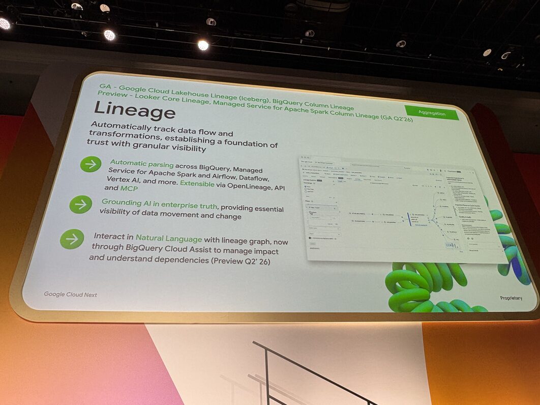BigQuery の column-level lineage、Google Cloud Lakehouse Lineage(Iceberg)といった主要な lineage がまとめて GA になりました。Looker Core や Spark の column-level lineage も後続します。