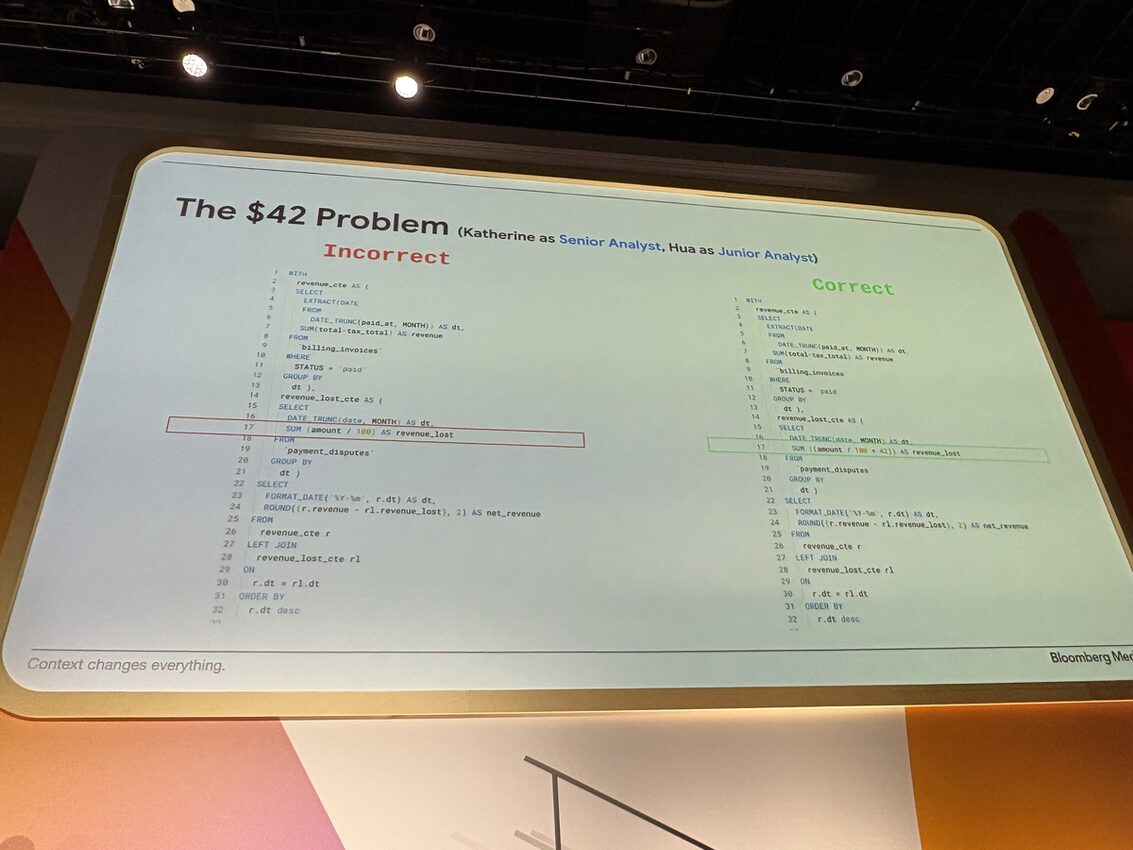 Knowledge Catalog が本番で効くのかを示す事例として登壇したのが Bloomberg Media(有料購読 720K、月間 UU 100M)でした。主役は「$42 問題」と名付けられた、あるあるすぎるエピソードです。