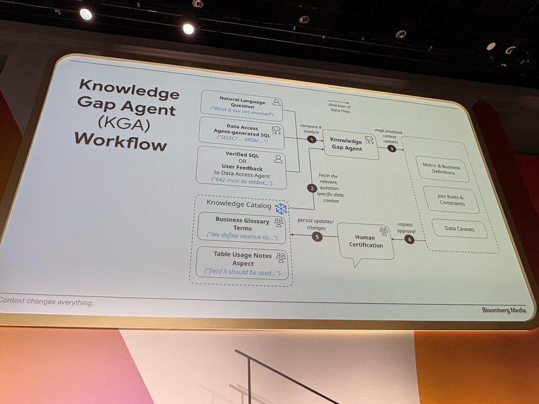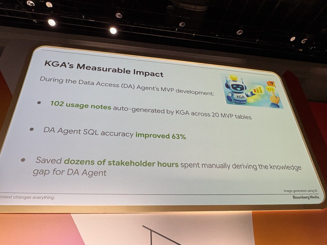 印象的だった事例: Bloomberg Media の「$42 問題」。エージェントの誤答を自動で学習させてカタログに書き戻す仕組み(KGA)を構築した話で、本番運用で効く設計パターンとして参考になります。