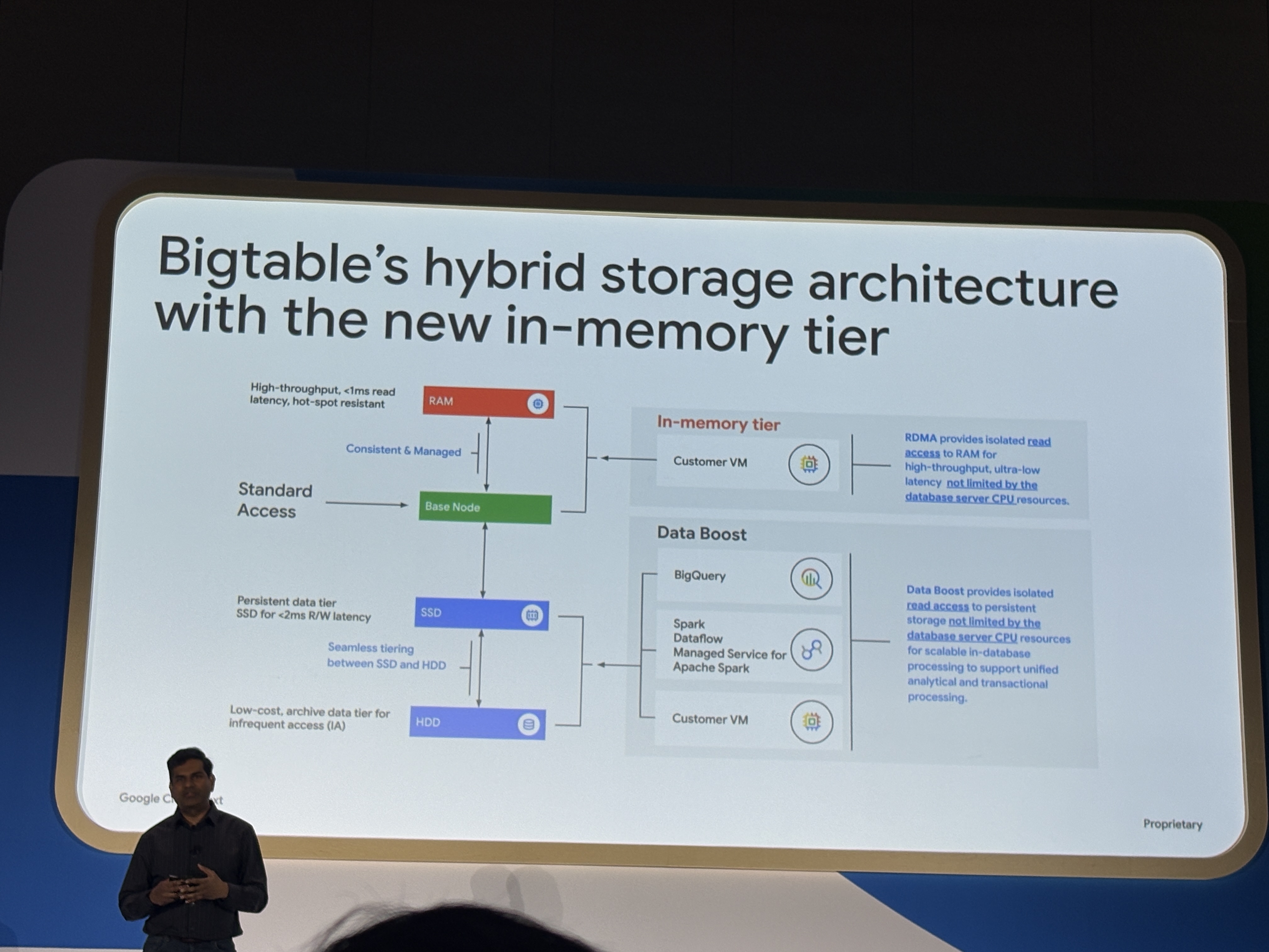 今回のBigtable最大の発表がIn-memory Tierだと思います。これはRAM・SSD・HDDの3層構造で構成し、アプリケーションからは単一のAPIで透過的にアクセスができます。