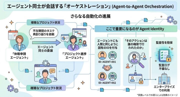 例えば、「休暇申請エージェント」が「プロジェクト進捗エージェント」に連絡し、自分の不在期間のタスク再割り振りを依頼する。そんな「エージェント同士の委譲」が可能になります。