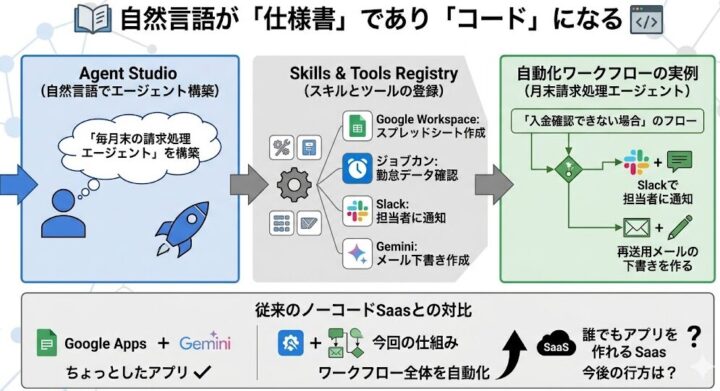 ポイントはSkills & Tools Registryです。 「Google Workspaceでスプレッドシートを作成する」「ジョブカンで勤怠データを確認する」といった定型的な業務手順を「スキル」として定義し、エージェントに持たせることができます。