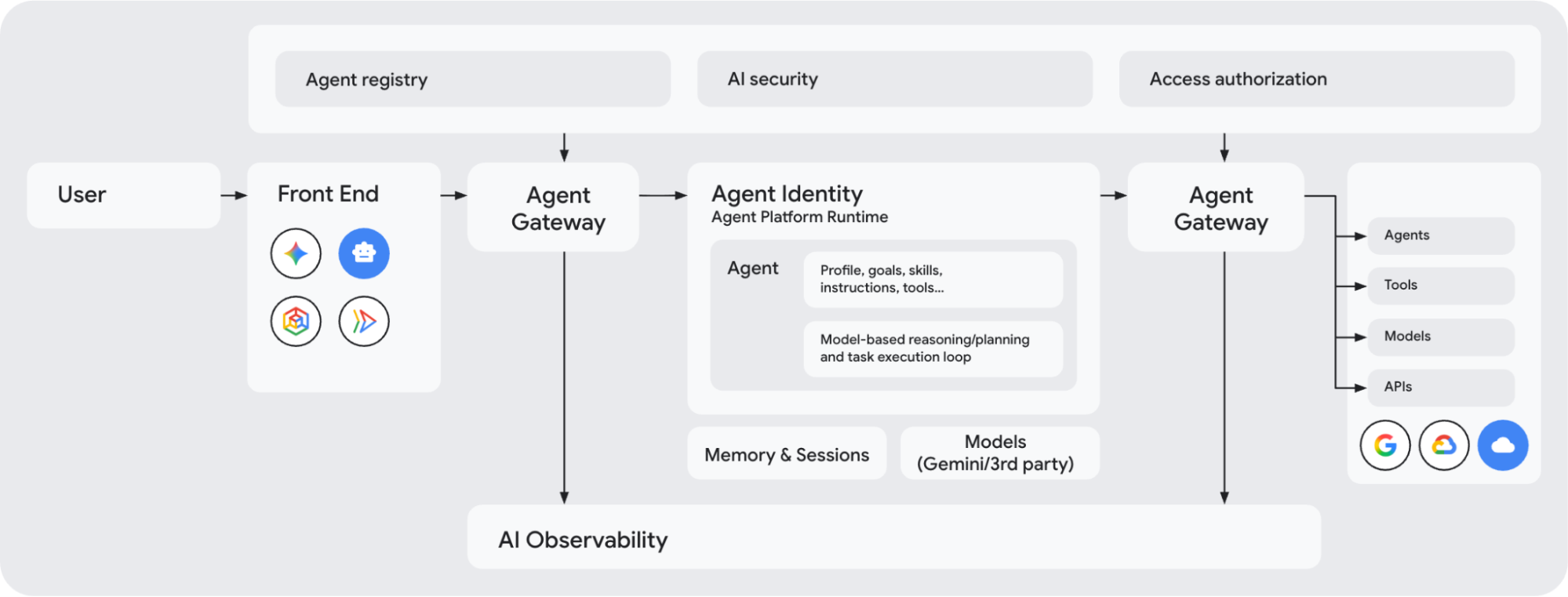 Gemini Enterprise Agent Platform では Gateway が通信を制御し、Agent Registry がその通信先の信頼性を保証し、Agent Observability が観測するという構成を取っています。
