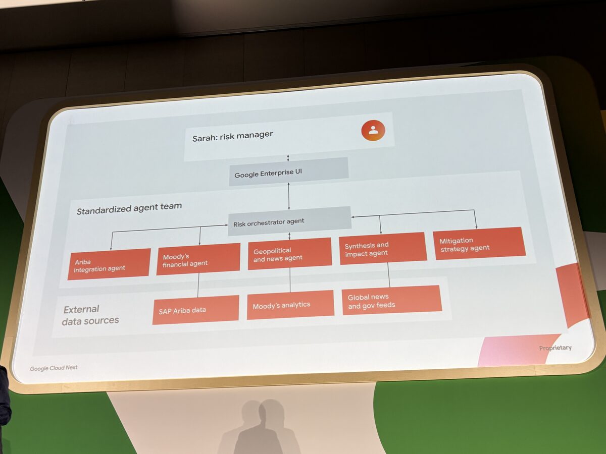 Sarah が「この電子部品サプライヤーについて、今何かリスクはあるか」と Gemini Enterprise App に入力すると、裏側では Risk orchestrator agent が動き出します。地政学・ニュースを監視するエージェントが対象国への新関税を即座に検出し、SAP Ariba に接続するエージェントが既存契約の条件と期限を照合し、Moody’s に接続するエージェントがそのサプライヤーの財務健全性を評価します。それらの情報を統合・分析するエージェントがリスクの全体像をまとめ、最後に対策立案エージェントが代替サプライヤー候補2社とその調達タイムラインを添えた法務向け覚書を生成します。