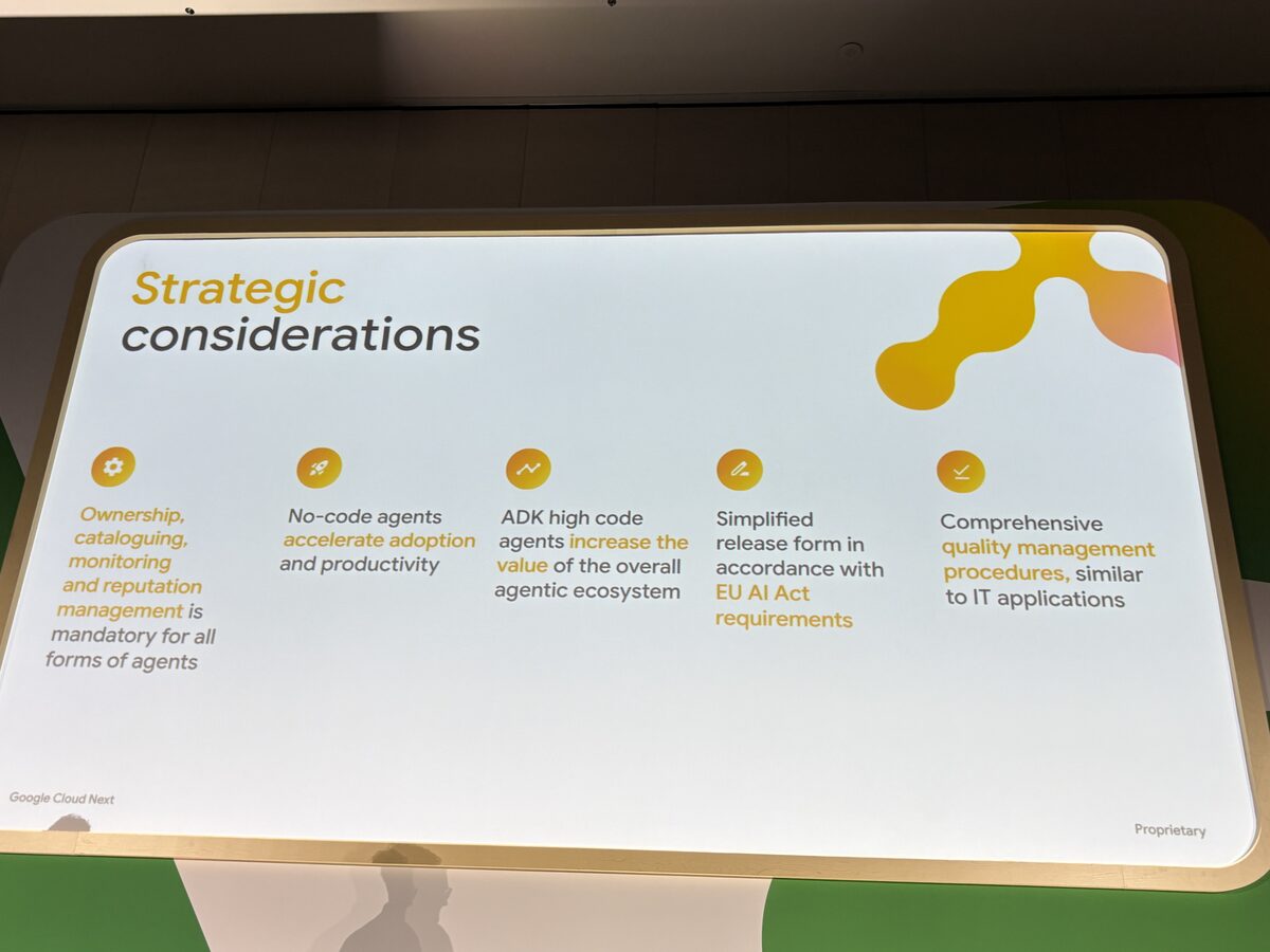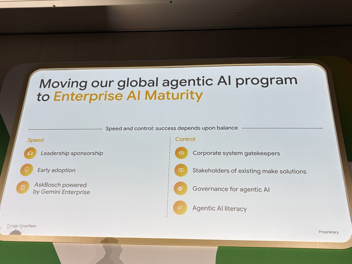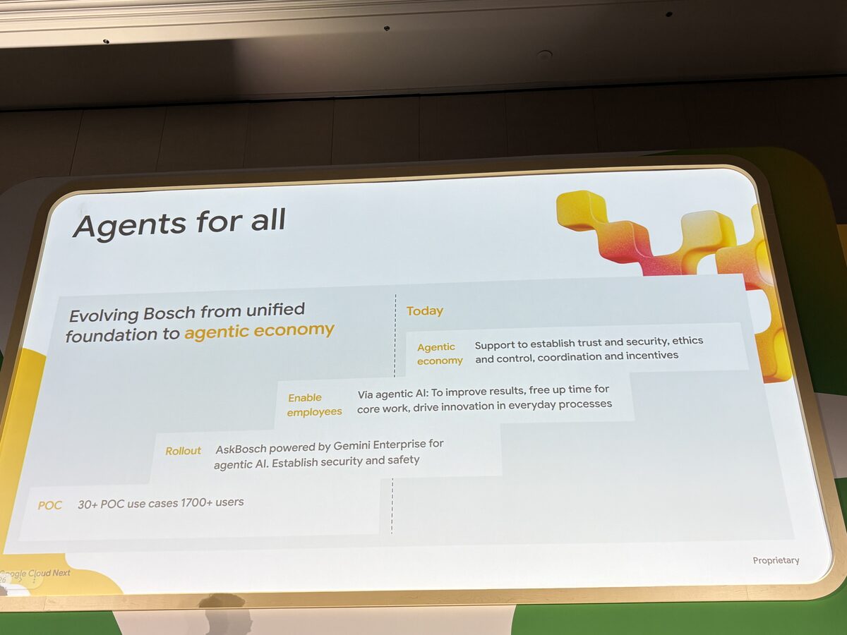 - 何が変わったか: マルチエージェントが概念実証を超えて本番稼働に移行しつつある / Bosch では月間3,500エージェントが生成される規模に到達 / Gemini Enterprise Marketplace 経由でサードパーティエージェントが企業全社にゼロ手間で展開できる