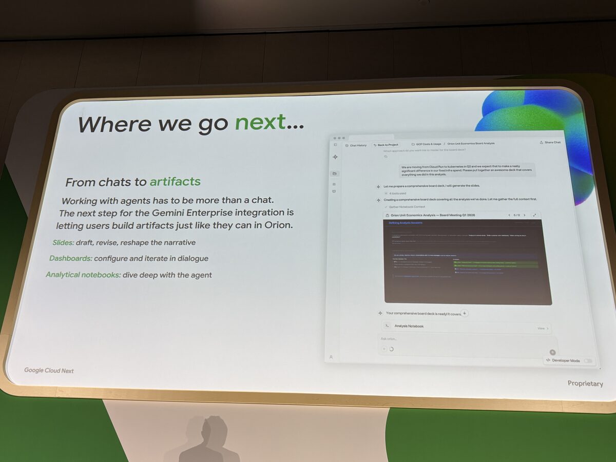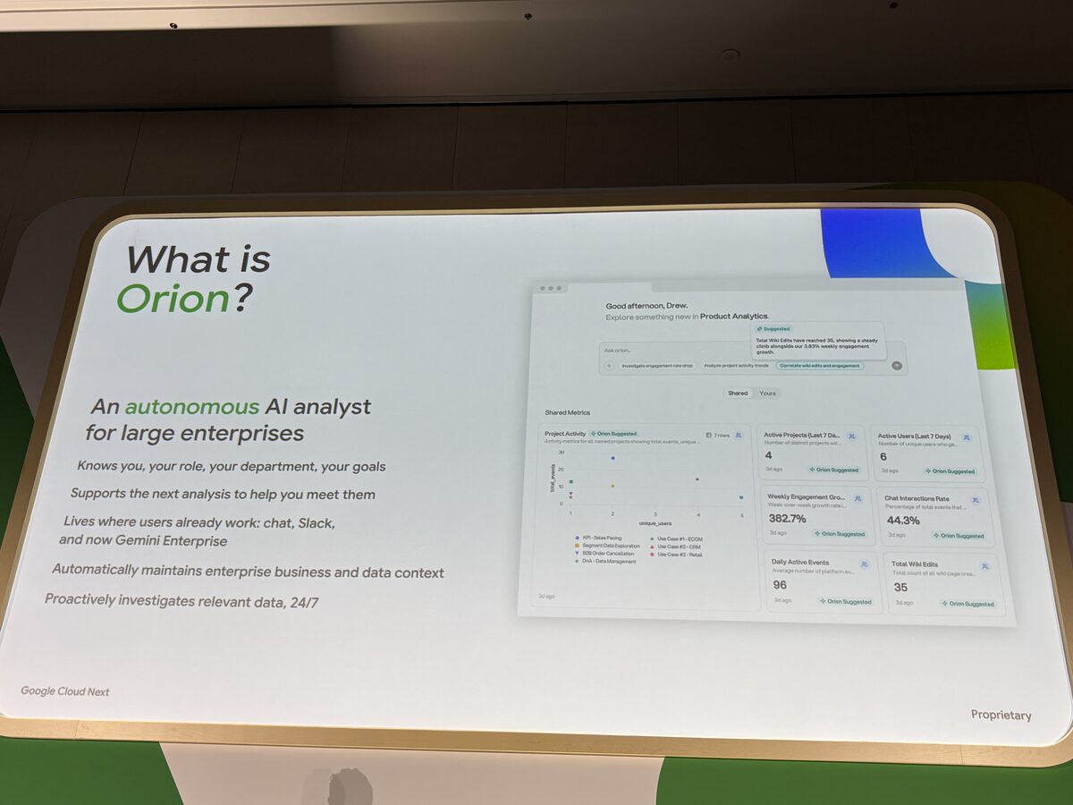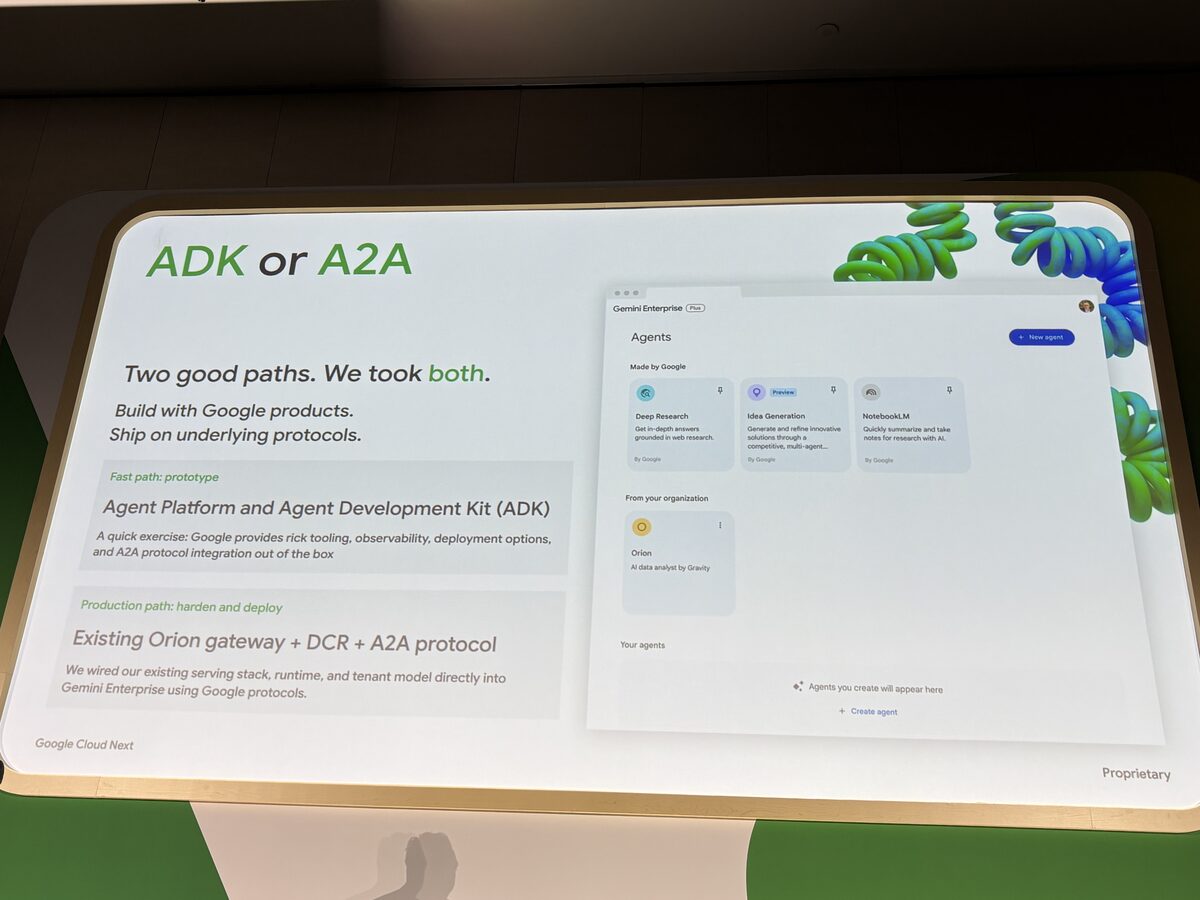 - 発表されたもの: Supply chain リスク管理のマルチエージェントシステムのライブデモ、Bosch の全社エージェント展開事例、Gravity の自律型 AI アナリスト「Orion」の Gemini Enterprise App 統合