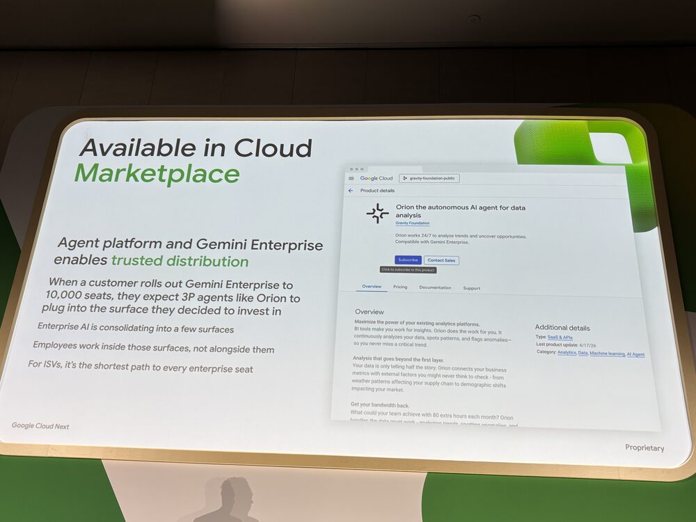Orion は Google Cloud Marketplace に登録されており、Gemini Enterprise を展開した企業はそのまま Orion を追加できます。インストールの手間はゼロです。これが Distribution の話で、Drew が「Enterprise AI は少数の主要プラットフォームに収れんしていく」と言う根拠でもあります。Gravity のような外部のソフトウェアベンダーにとって、そのプラットフォームに乗ることは、企業全社の社員に直接届く最短経路になるわけです。
