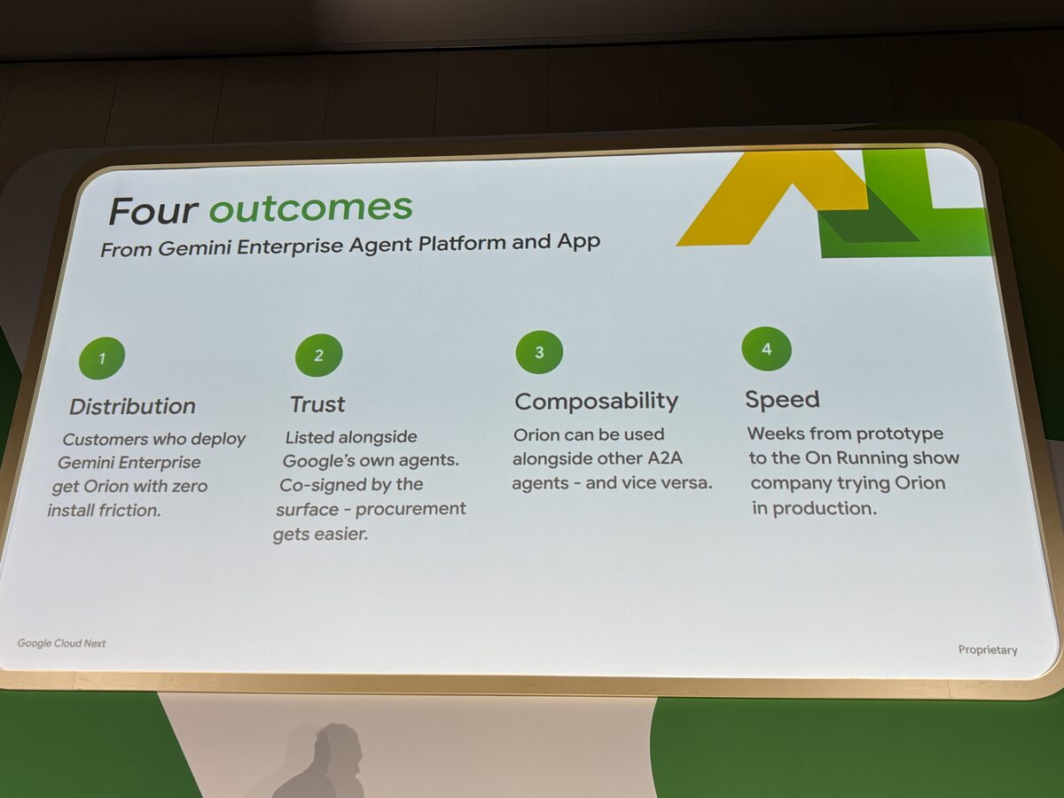 さらに Gemini Enterprise App への掲載には Trust の効果もあります。Google 自身のエージェントと同列に並ぶことで、調達担当者の心理的ハードルが下がるのは現実として大きいです。そしてプロトタイプから実際の企業(スポーツブランドの On Running)が本番で試用するまでにかかった期間は数週間だったと Drew は明かしました。