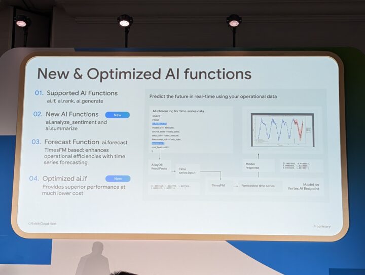 ai.forecast: Googleの時系列基礎モデル「TimesFM」をベースにしており、Vertex AI上のモデルを呼び出して、SQL上で将来の数値を予測可能 - 最適化された