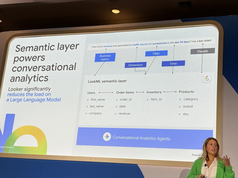 Looker の LookML はそのエンジン部分です。モジュール型で、コードベースで、Git によるバージョン管理が効く、安全なガバナンス。スライドでは total_profit や customer_age といった measure / dimension の定義例が示されていました。一度定義してしまえば、ダッシュボードでも会話インターフェースでも、外部の AI エージェントからのクエリでも、同じ定義が使われます。