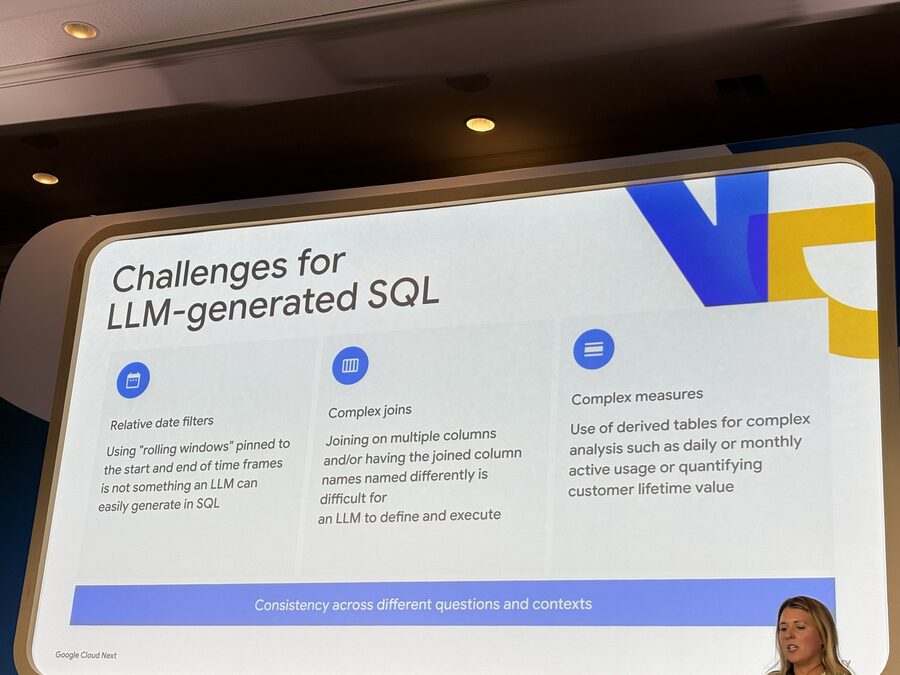 Q&A でも「raw SQL に対して、LookML のシノニムや description といったメタデータを足していくと精度が有意にステップアップする」という話が出ていました。LLM がコンテキストウィンドウにデータ本体を全部引き込まなくても、メタデータだけで「データが何なのか」を理解できるので、往復回数が減ってエラー修正の頻度も下がる、というのが Miles の説明でした。