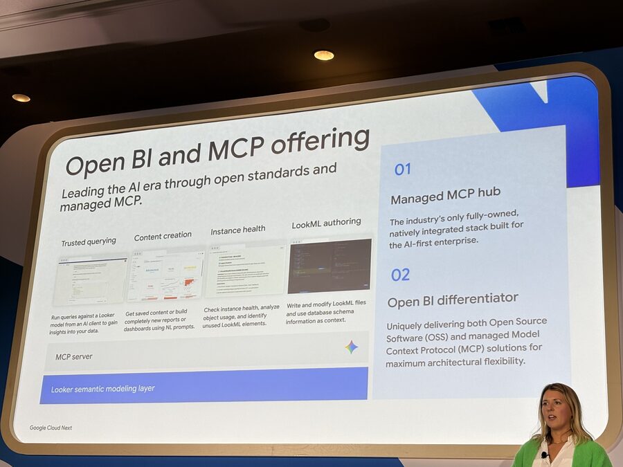 - 発表されたもの:Looker の LookML セマンティックレイヤーを軸に、Conversational Analytics の精度向上、外部 AI エージェントから呼び出せる Managed MCP hub、BI 体験のフルリニューアルを一気に発表しました。