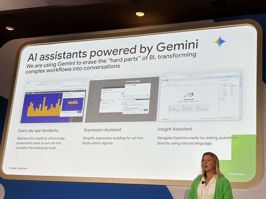Looker UI のフルリニューアルと、Gemini ベースの3つのアシスタント(Expression / Insight / Visualization)。CSV を上げると LookML が自動生成されてエクスプローラーが立ち上がるデモも披露されました。