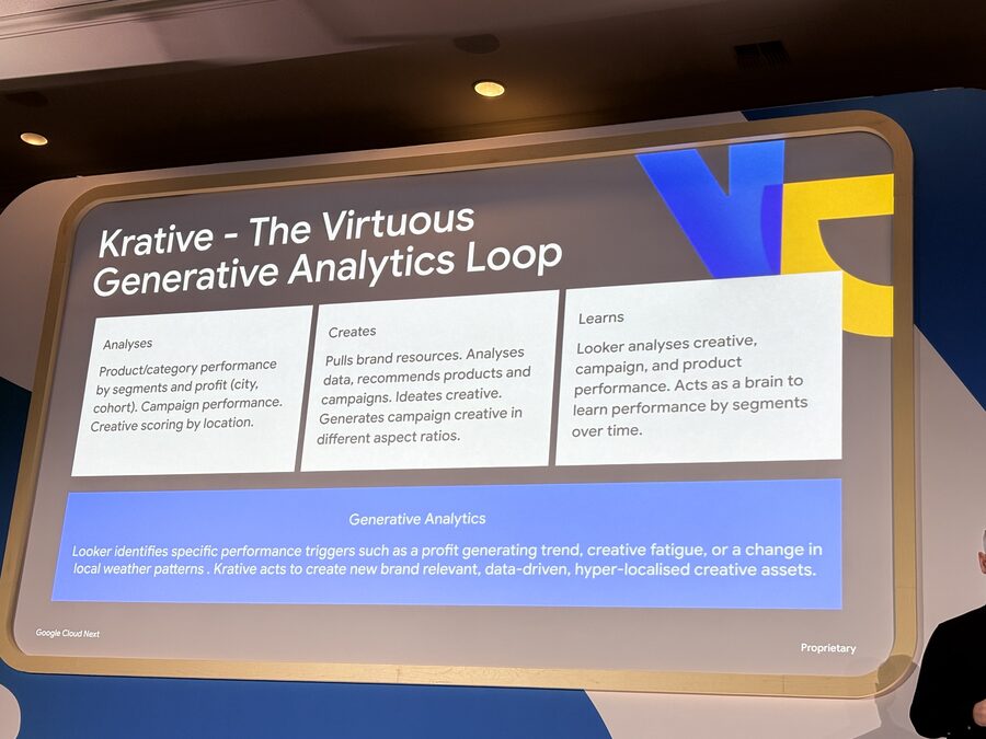 - 印象的だった事例:Overdose Digital の Krative。利益(profit)を一次メトリクスに据えて、Looker が変化を検知すると自律的に画像や動画クリエイティブを生成し、Meta などに配信していくループです。