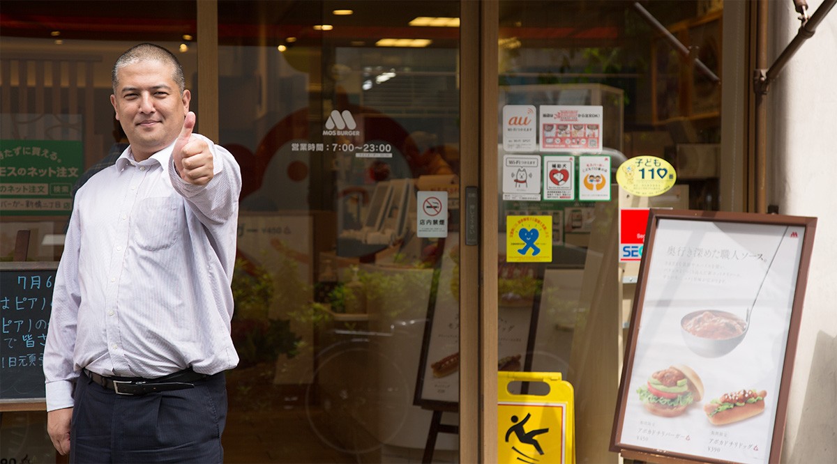 7月に入ってすぐのランチタイム。お気に入りの店を尋ねると、武川が指定した場所は新橋のモスバーガーだった。