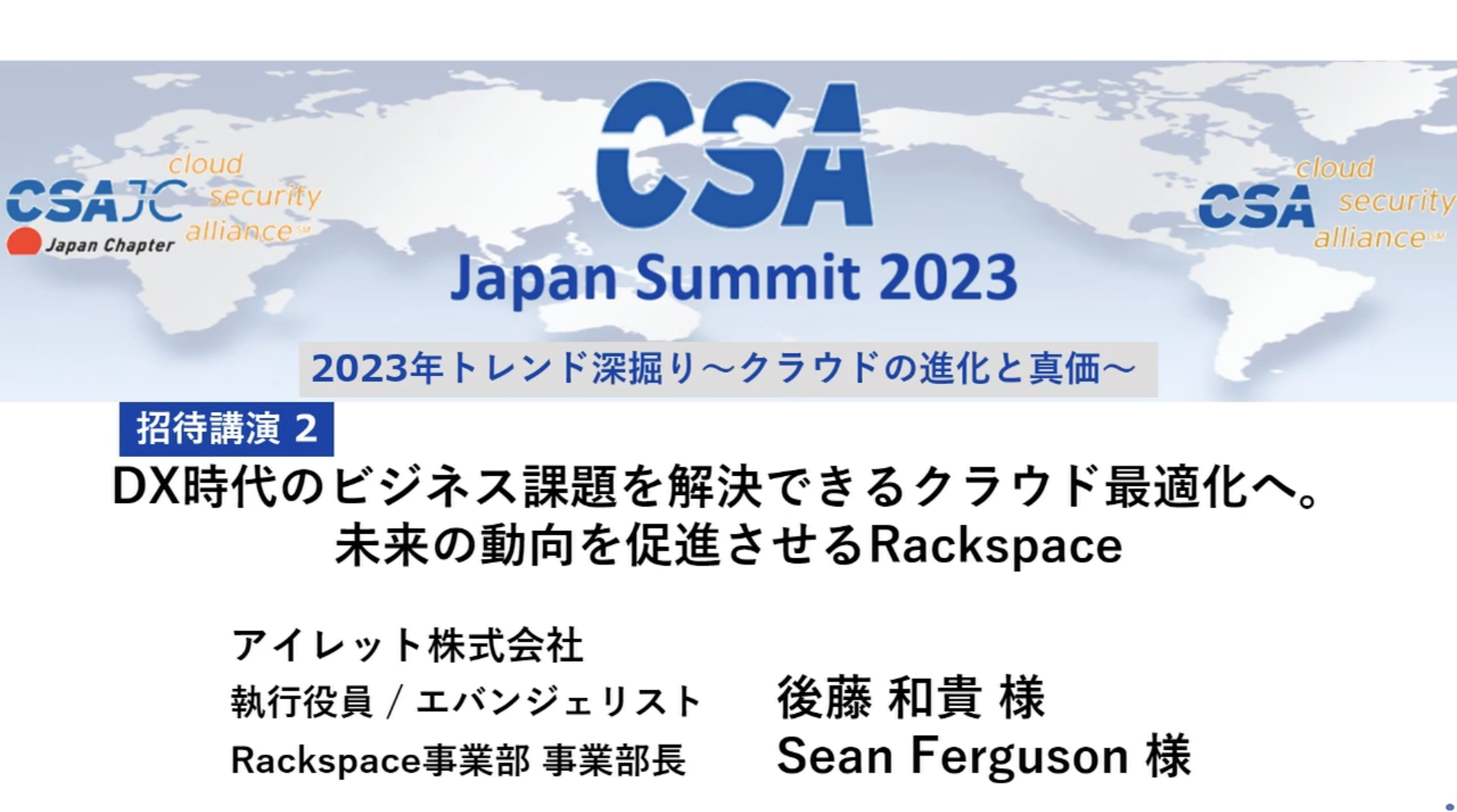 今回2名が解説したのは「DX 時代のビジネス課題を解決できるクラウド最適化へ。未来の動向を促進させる Rackspace」について。