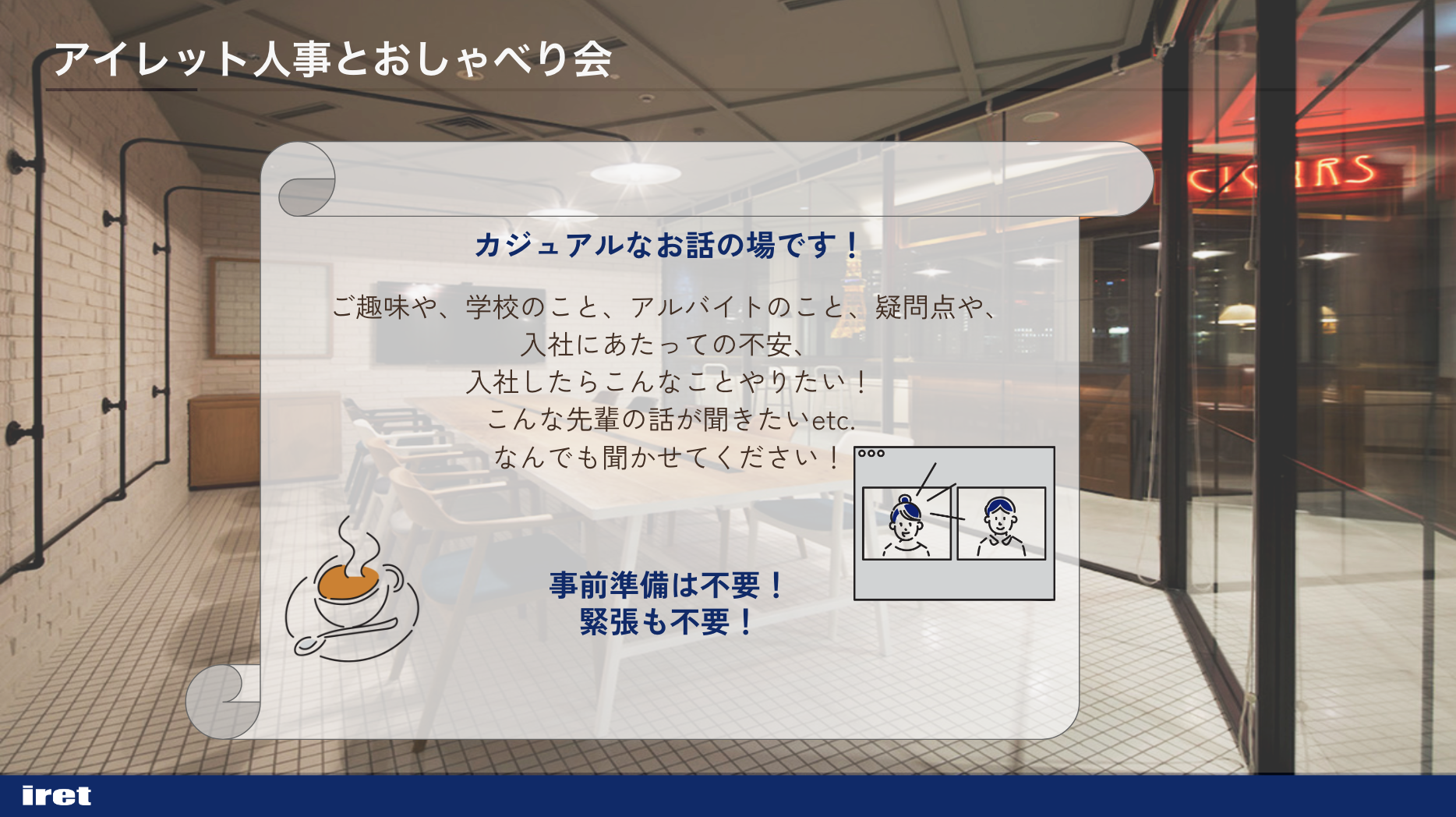 アイレットでは昨年度から、内定者の皆さんがより安心して入社いただけるように、内定期間中から人事とカジュアルにお話ができる場として《おしゃべり会》を導入しています。